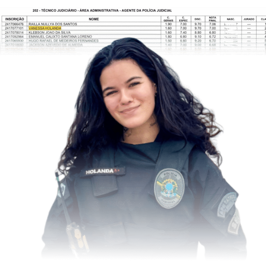 Em 2021, criei o Aluna Policial, que em apenas 6 meses alcançou mais de 500 alunos. Em 2025, lancei a Mentoria Holanda, oferecendo acompanhamento individual e exclusivo. Vamos juntos!